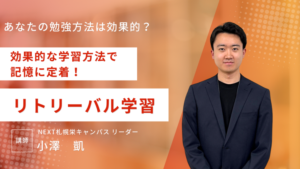こんにちは!NEXT札幌栄キャンパスの小澤です! 今回は効果的な勉強方法である、「リトリーバル学習」についてご紹介します! 目次 1 リトリーバル学習2 リトリーバル学習の効果2.1 記憶の強化2.2 メタ認知の向上3 リトリーバル学習の方法4 終わ … 続きを読む 効果的な学習方法で記憶に定着!リトリーバル学習